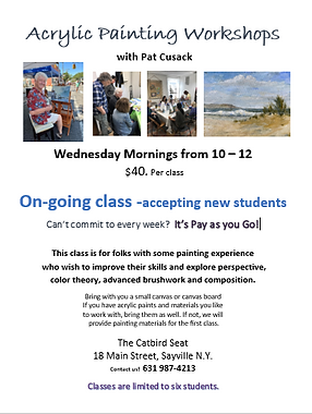 Right now we have two ongoing acrylic paining classes and we are hoping to schedule watercolor, pastel and basic drawing classes soon.
